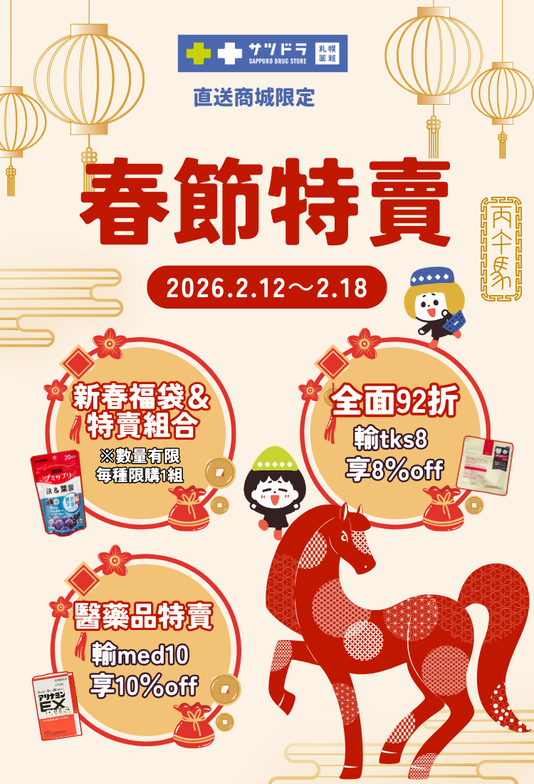 2.12~2.18 新春限時特惠! 輸碼【tks8】全面92折|超值福袋,新春特賣72折起|醫藥品9折|首單輸碼【sds500】立減500円 More
