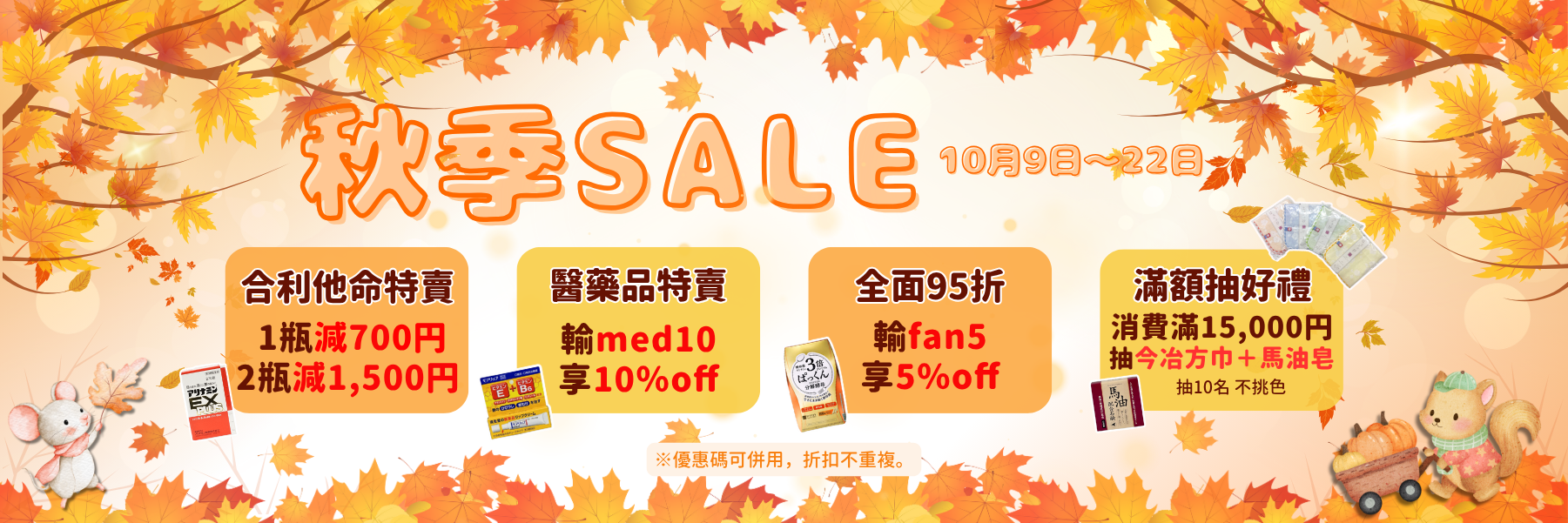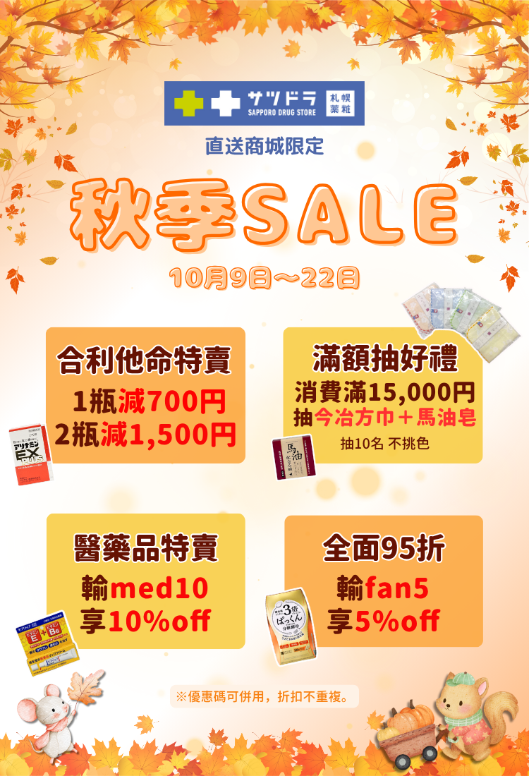 10.9~10.22 秋季Sale.合利他命特賣|結帳輸【fan5】全品5%OFF|醫藥品輸【med10】10%OFF|首單滿6999円,輸【sds500】減500円