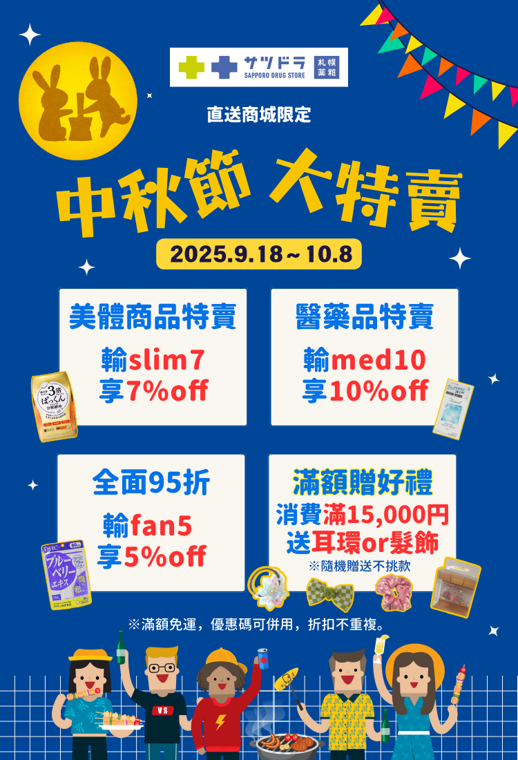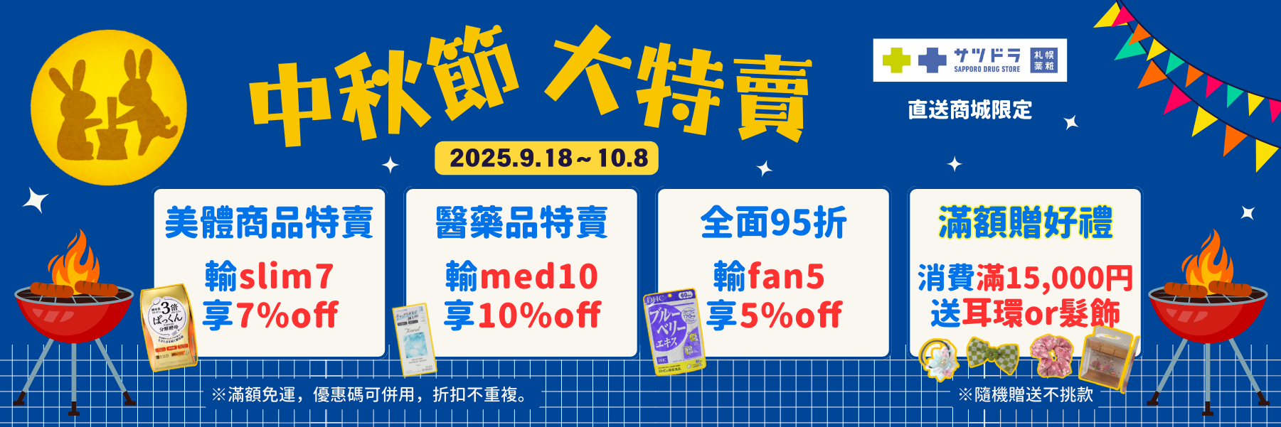 9.18~10.8 中秋節大特賣結帳輸【fan5】全品5%OFF| 瘦身美體商品輸【slim7】7%OFF|醫藥品輸【med10】10%OFF|首單滿6999円,輸【sds500】減500円